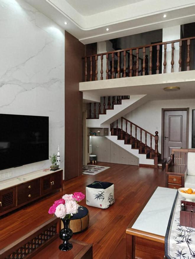 复式楼最吸引人的特点,就是“视觉上占便宜”。挑高的客厅、上下两层的结构,让人第一眼就觉得空间很豪气,仿佛面积翻倍了。